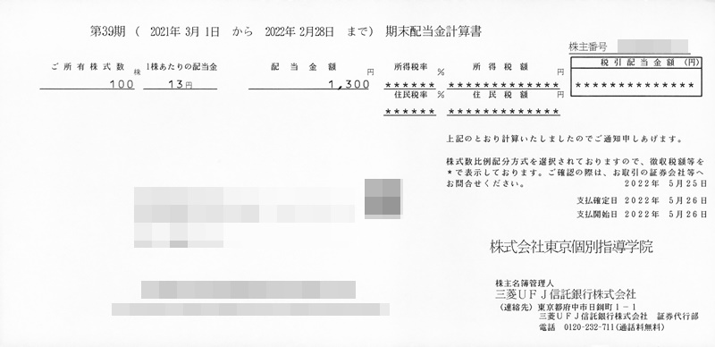 東京個別指導学院の配当金(2022年2月権利確定分)